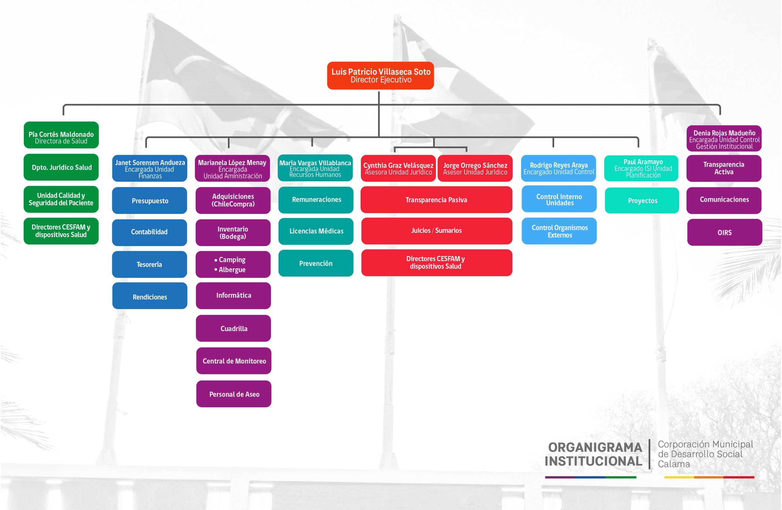 Actualmente la corporación es liderada por el señor Luis Patricio Villaseca Soto como director ejecutivo, y bajo su dirección le acompañan las unidades de: Control Interno, Jurídico, Dirección de salud, Administración, Finanzas, y RR.HH.